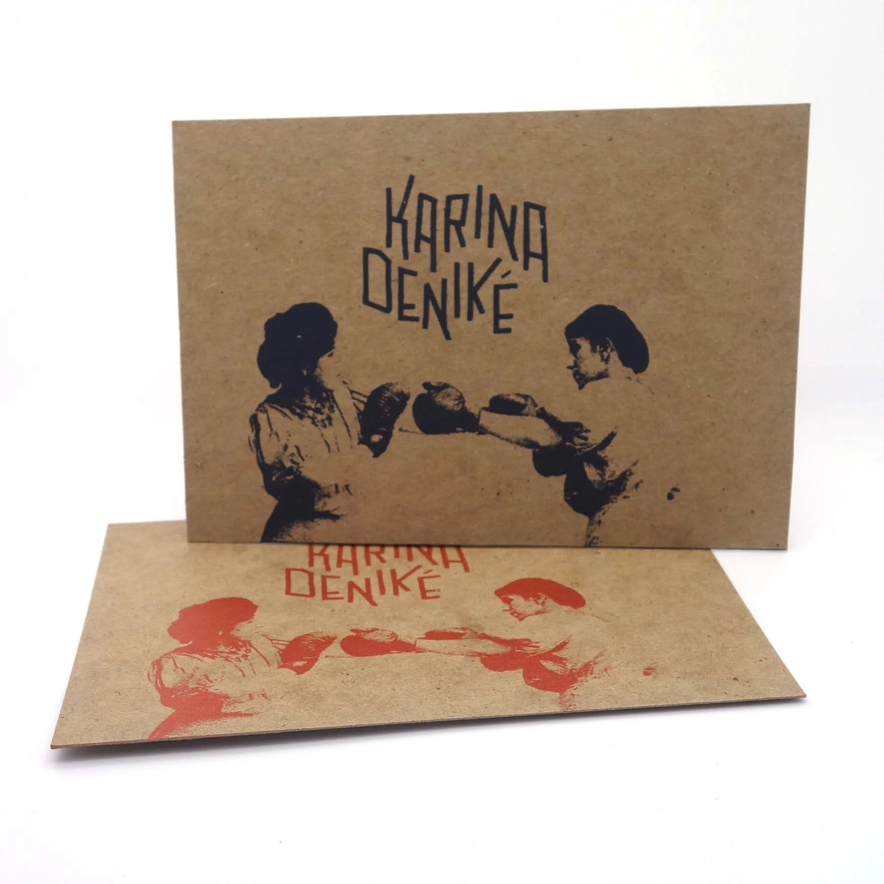 Screen-print and design of promotional cards for the Karina Denike album release event in Oakland, Ca. Navy blue and metallic copper inks on tagboard.