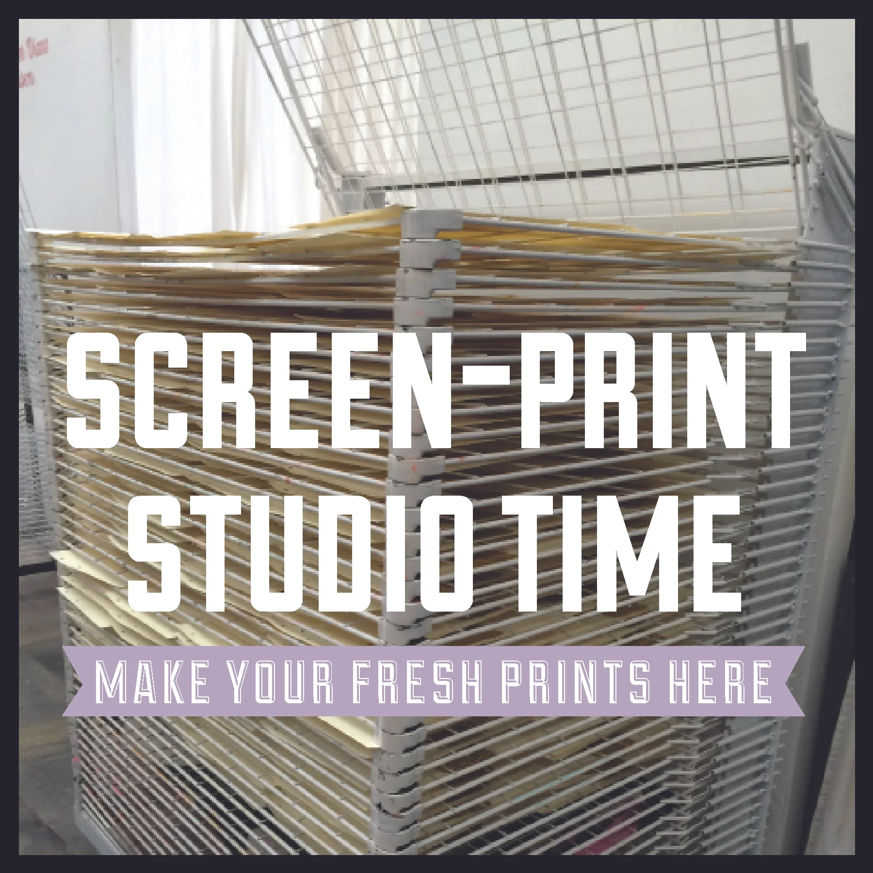 Have some artwork you’re dying to print? Need a primo screen-print studio to pull it off? Screen-print Studio Time is a great opportunity to create your own art at the Compound Gallery Studios. Studio Time will be supervised by Defne Beyce, who will be available to help trouble-shoot and answer questions. Previous screen-print experience is required for Studio Time. Beginning screen-printers are encouraged to take one of our screen-printing workshop to learn the ropes. We have a large exposure unit, a heat press, hinge-boards, and a t-shirt press. Water based inks only.